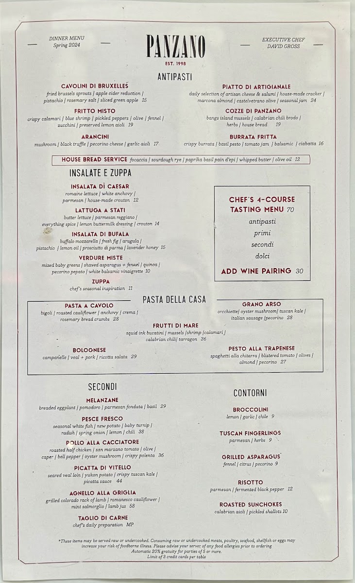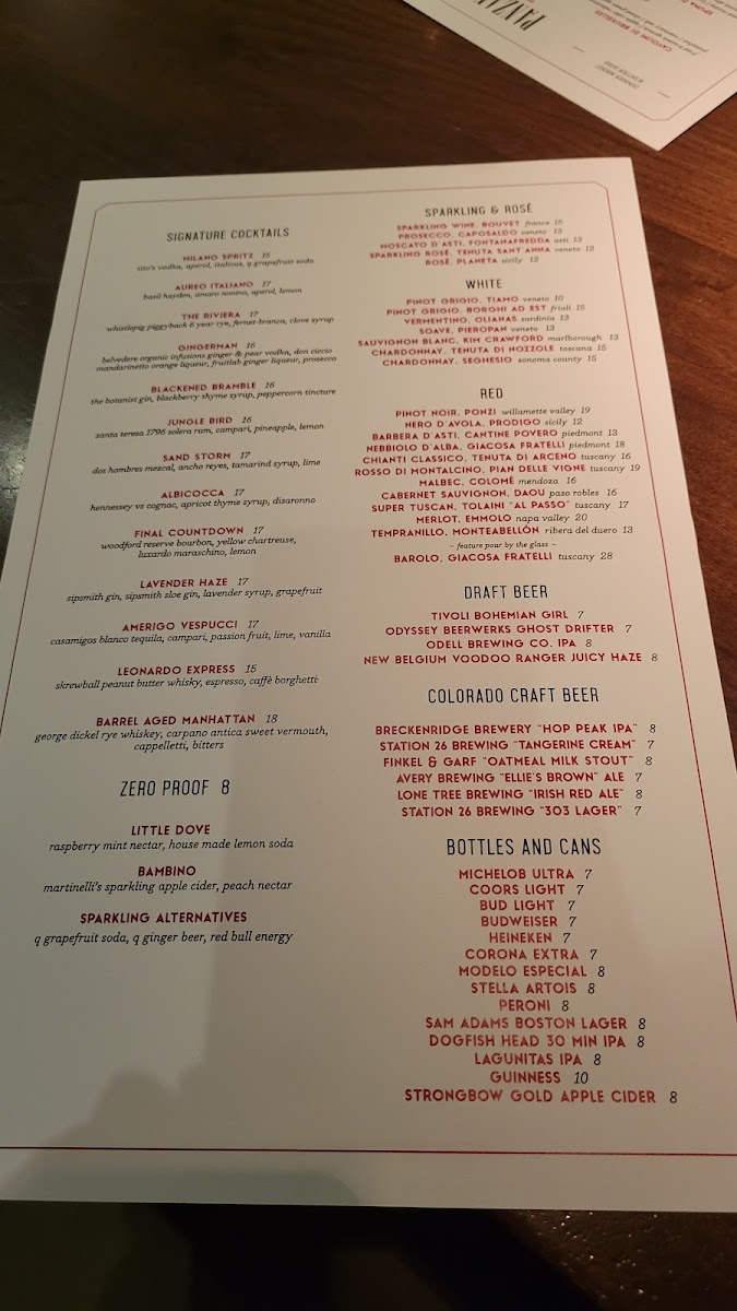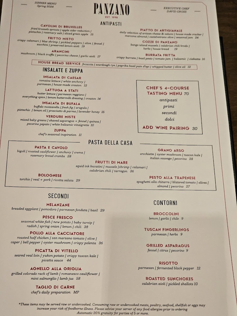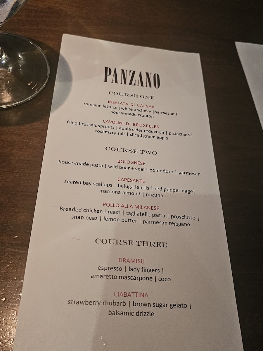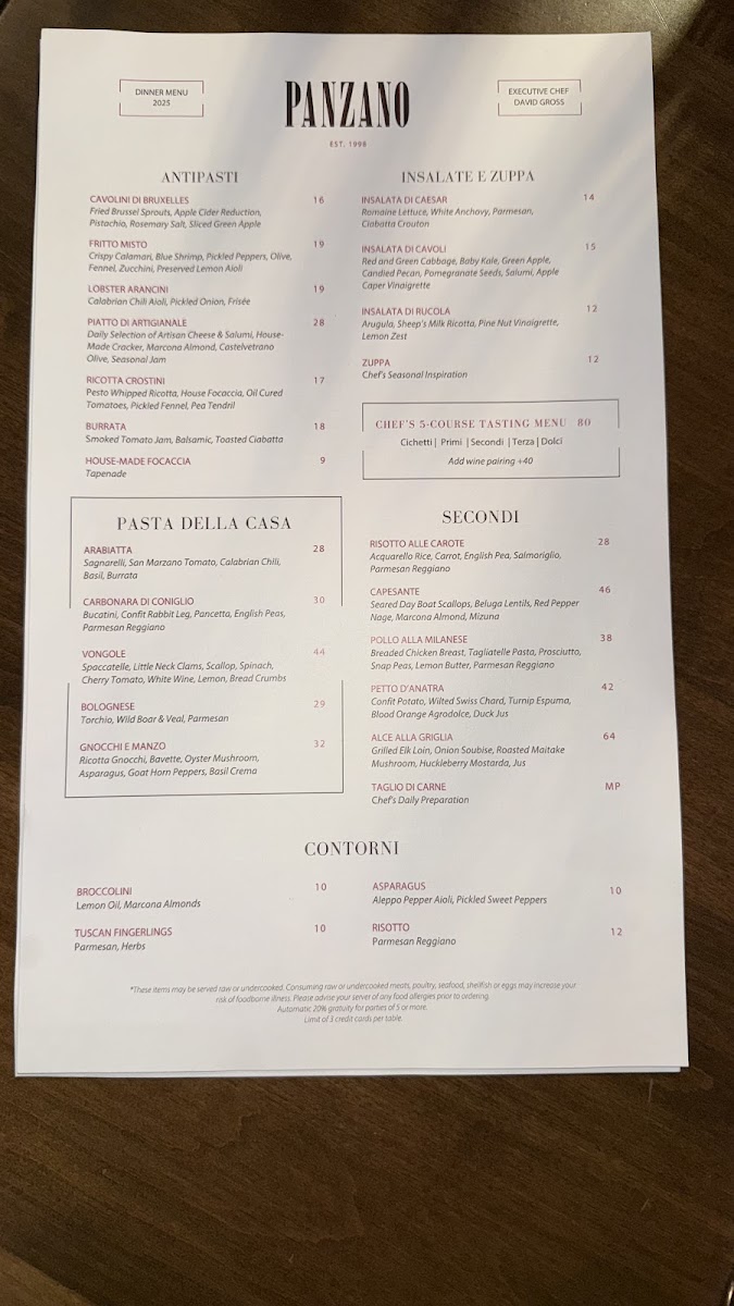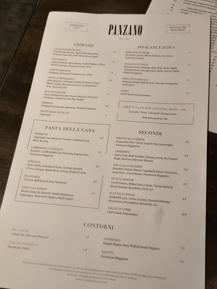 My mom and I came to Denver back in October 2024. We found Panzano, looked at pictures and reviews, and immediately knew we were going to this place. However, we decided to postpone our visit due to timing knowing we’d be back thia summer. We got a reservation for Tuesday night and were ecstatic for our visit. We came with my grandparents to celebrate their wedding anniversary. The hostess seated us promptly. We were immediately greeted by one of our servers and given ice cold water and suggestions for appetizers. We ordered the burrata and caesar salad appetizers, which were both to die for. We ordered the arabiatta, the bolognese, the Risotto alle carote, and the pollo alla malinese, all of which were world class dishes. The flavors were well balanced and the portions sizes were appropriate and left enough for a full leftover meal. Needless to say, the deserts were out of this world. Our server Brian was very attentive but not intrusive at all. Watching the chefs was amazing and it shows how hard they really work. 10/10 restaurant, will certainly be returning.
