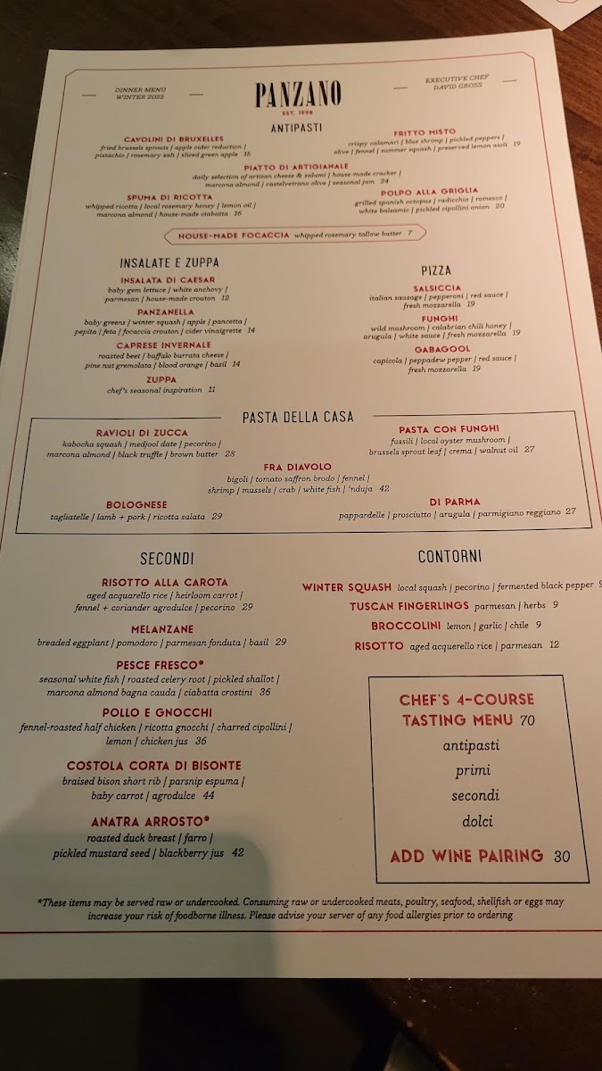 Panzano's 70 4-course tasting presented a considered exploration of Italian flavors. It was a well-priced opportunity to sample a range of offerings and it presented good value for the quality. A 30 wine pairing option was available to enhance the meal. We arrived and were seated in the main dining room at a booth. Our server, Brian, was a notable asset to the experience. His recommendations for cocktails & desserts were accurate and well-received, demonstrating a good understanding of the menu and a helpful, efficient service style. The Chef's 4-course tasting menu came with an Antipasti, Primi, Secondi, & Dolci dishes. The meal began with a Panzanella salad (Antipasti course), a balanced mix of textures and flavors, featuring kale, squash, and a pleasant tang from the sherry vinaigrette. The pasta course (Primi course), with options like wild boar Bolognese and sausage orecchiette, provided hearty & satisfying dishes. The Secondi course, Seared Pork Tenderloin main was cooked precisely. The dessert selection (Dolci course), particularly the Butterscotch Pudding, was a highlight! A well-paced, thoughtfully prepared Italian meal in Denver, Panzano delivered. The classic dishes were executed with care, and the attentive service by Brian, allowed the food to take center stage.