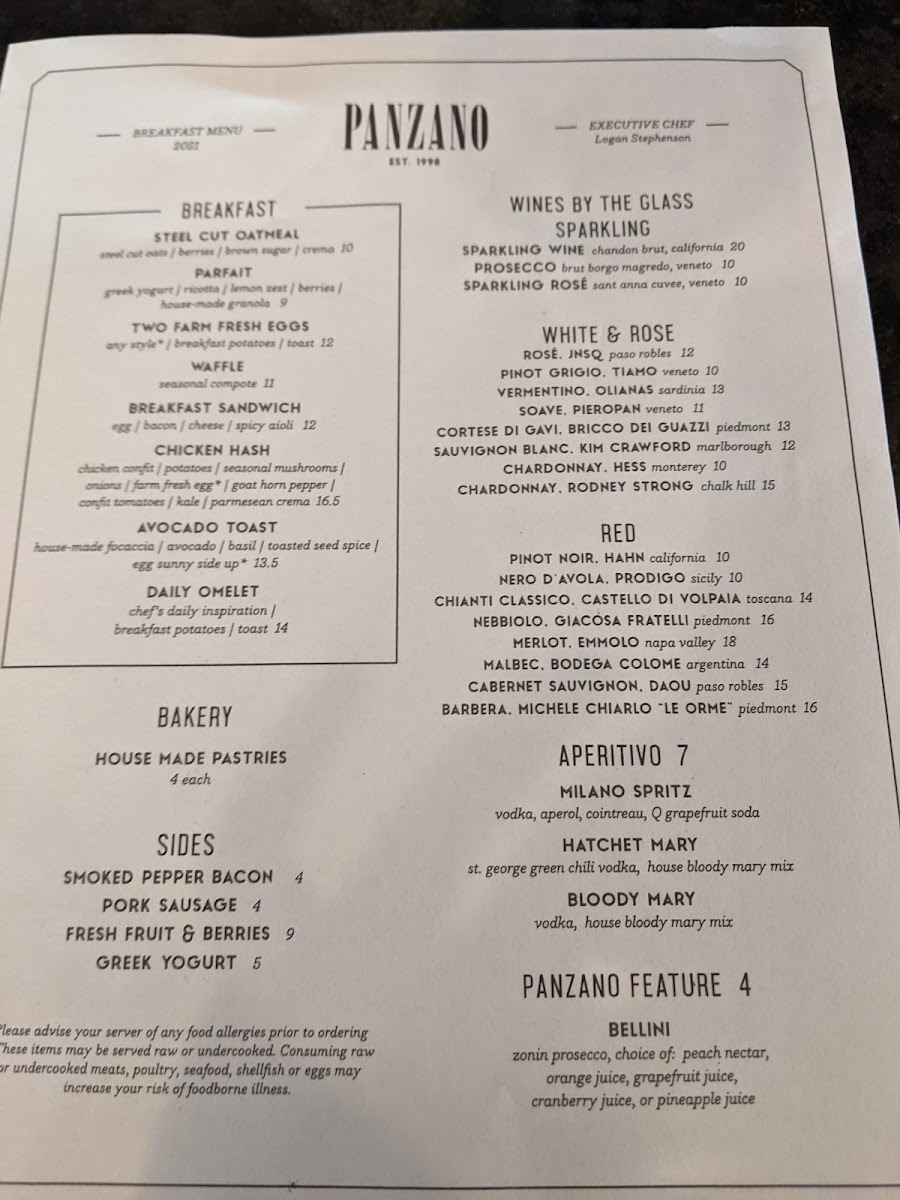 Located in the Kimpton Hotel Monaco, we had breakfast at Panzano this morning and had a wonderful time. The breakfast sandwiches were amazing, and the service was outstanding. I'd love to try it out here for dinner one day. The place has won a number of awards.